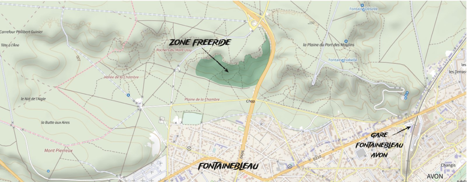 Le spot se situe aux abords de la ville de Fontainebleau, et s'étale sur une surface d'environ 13,5 hectares (cf. carte). Il est géré de manière conjointe par l’ONF et l’association, suivant une convention établie entre les deux organismes.